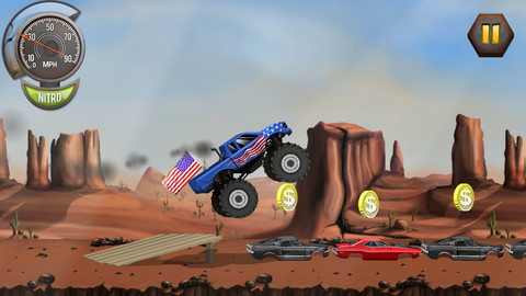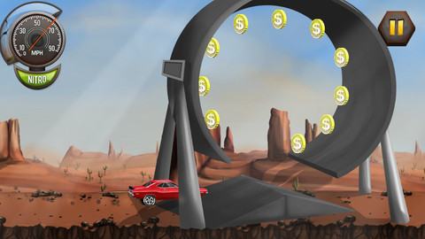 游戏中玩家的目标是在规定的场景赛道内控制好车辆完成相应的动作并获取尽可能多的钱币通过重点。控制方法简单,触摸屏幕的左右两边即可实现车辆的前进或后退,当车辆在空中时,触摸左右两边即实现车辆的翻转动作。