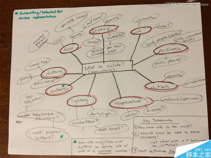 Jasmine:我建议你反复去看你列出的所有信息,就象我现在又在看你的头脑风暴图。你会发现,「哦,这个根本用不着」。砍掉那些多余的选择会让你的工作更轻松一些。比如说,「食物」这个要素对用户来说根本无关紧要,毕竟他们又不是想找餐厅。