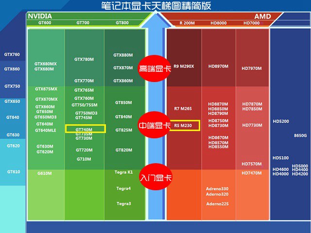 ■对于两款笔记本独立显卡的对比,目前最简单最有力的对比方面,就是对照笔记本显卡天梯图。从以下这张精简版笔记本显卡天梯图中,大家可以一眼看出R5 M230显卡略微强于GT740显卡。